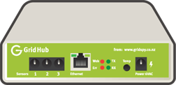 The GridHub uses a wireless link to connect to the GridNodes, sensors and other GridSpy devices. It collects the data and uploads it to the Cloud Dash directly via an Ethernet cable or using 3G.