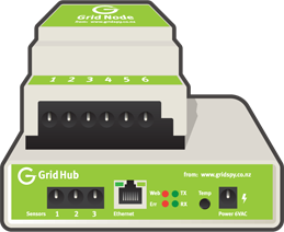 GridNodes measure Energy and anything with a pulse (see below) and send it via a long range radio link to the Gridhub that uploads to the web. All AC Nodes track the kWh using a factory set internal accumulating "register." Nodes are supplied complete with 6 x 60A CTs and optionally a versatile temperature sensor. Upgrades to larger CTs are available.